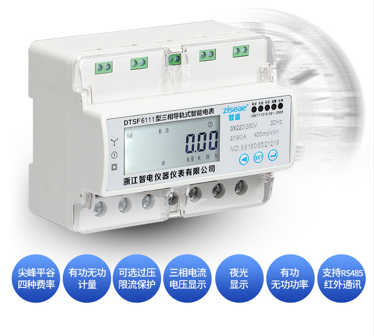 三相導軌式多費率電能表DTSF6111-7系我公司采用微電子技術計量電能,采用進口集成電路,應用數字采樣處理技術及SMT工藝等先進技術研制開發的電子式電能表。能直測量電能計量中正向有功電能,7位LCD顯示器顯示有功用電量,具有可靠性好、體積小、重量輕、外表美觀、工藝先進、35mmDIN標準導軌式安裝等特點:并具有良好的抗電磁干擾、低自耗節電、精度高、高過載、穩定性強、防竊電、壽命長,液晶屏幕上可顯示當前總電量,無功電量,尖峰平谷的電量,電流,電壓,功率,功率因素,頻率,支持RS485 DL/645--2007或MODBUS通訊規約。